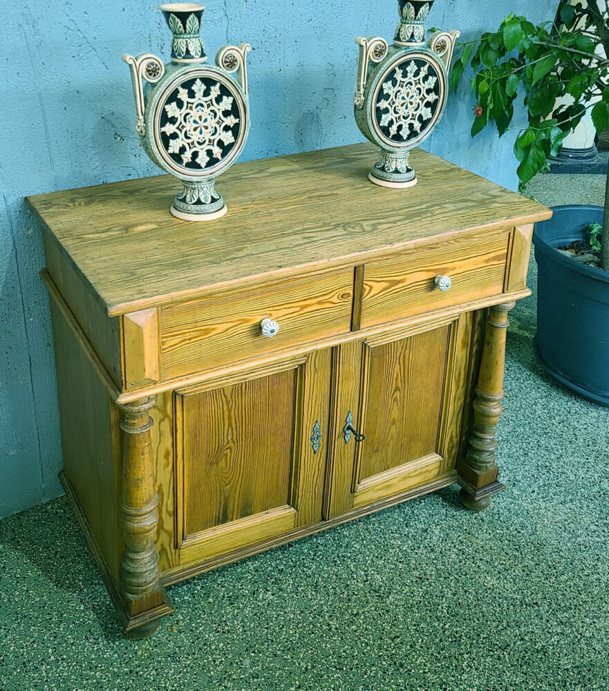 Ein weiterer Unterschied zum Inventar aus der heutigen Zeit ist die Konstruktion. Während seit dem 20. Jahrhundert überwiegend Massenware mit Maschinen für die Kaufhäuser produziert wird, erwerben Sie mit Antiquitäten einen individuellen optischen wie praktischen Deco-Wert. So ist die Biedermeier Weichholzkommode, die um 1840 aus massivem Lärchenholz gefertigt wurde, ein wahres Struktur-Glanzstück. Wenn Sie bei uns eine antike Anrichte kaufen, können Sie sich auf ein schlichtes, aber dennoch ausgefallenes Design freuen. Ebenfalls typisch für die Epoche sind die stilgemäßen Verzierungen an den Schlüssellöchern.